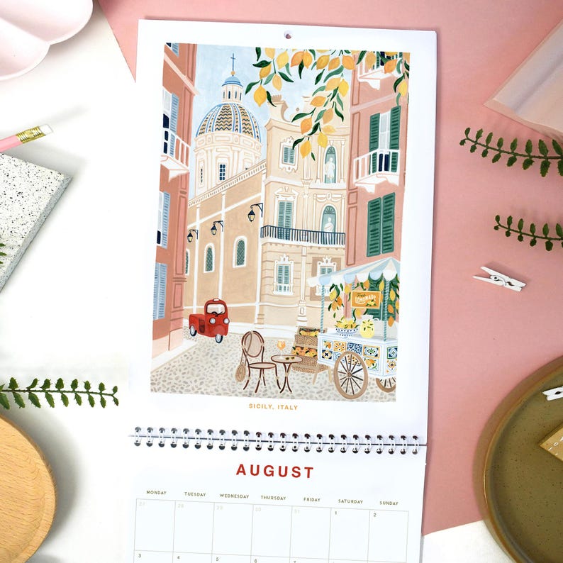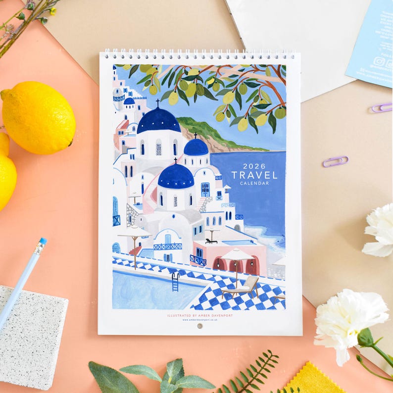 Discover the magic of travel month by month with our 2026 Travel Wall Calendar. From the golden autumn streets of New York City to the dramatic cliffs of Santorini, experience the beauty of these stunning locations from the comfort of your own home. Featuring acrylic paintings by Amber Davenport, this calendar is more than just a date keeper.
